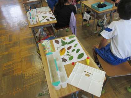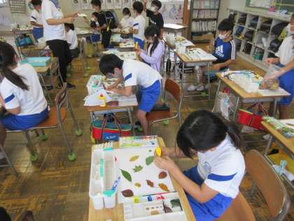 3年生の図工「身近な自然の形・色」の授業です。いろいろな色を出している自然の落ち葉を使って表現していました。