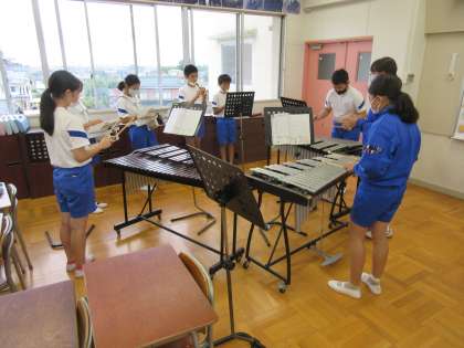 6年生の音楽「合奏」です。いろいろな楽器の音色の特徴を生かして、みんなで合奏の練習をしていました。中学生が4人そろって支援に入ってくれました。