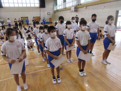 今朝は体育館に集まり、後期の学級委員の任命式&表彰を行いました。学級委員さんには自信をもって、クラスをよくするために働いてほしいと思います。表彰された児童はよく頑張りました。最後に、今日でチャレンジウィークを終える中学生がお別れのあいさつをしました。中学生からは、たくさんのことが学べた充実感が感じられました。