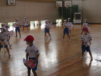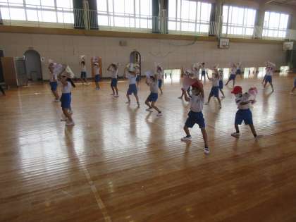 運動会で披露する花笠音頭の練習を行っていました。代表の児童がステージ上で手本となり踊っていました。みんなだいぶ踊りっぽくなってきました。