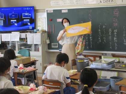 「ごはん・牛乳・真鯛の甘辛揚げ・お月見汁・小松菜のごま和え」の十五夜献立です。明日が十五夜ということにちなみ、お月見汁が出ました。かぼちゃで色付けした黄色い餅が、満月のようでした。また、今日は愛媛県産の真鯛がふるまわれました。これは、愛媛県のタイの養殖業者から群馬県が消費拡大のために仕入れ各市に配送してくれたのだそうです。から揚げに甘辛のたれがかかっており、抵抗なく食べることができました。今日は子どもたちの食べている様子を給食センターの栄養士さんが見に来てくれました。