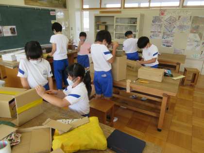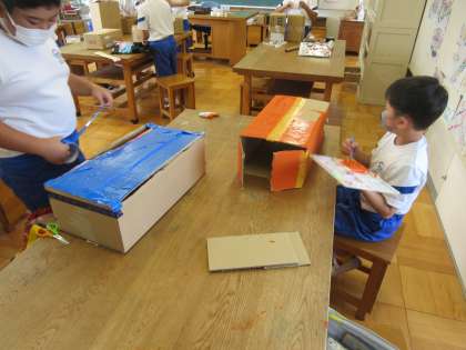 4年生の図工「おもしろ段ボールボックス」の製作です。だんボールに色が塗られ始めてきました。だんだんと形がわかってきて先が楽しみです。