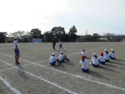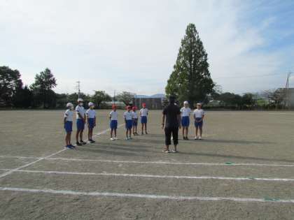校庭にはさわやかな朝の風が吹いています。今朝から陸上教室記録会のためのリレー練習が始まりました。先生の話をしっかりと聞いて、いかにバトンが早く渡せるか練習をしていました。