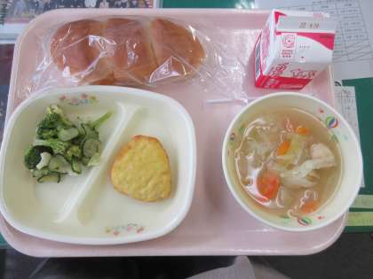 「ロールパン・牛乳・チキンピカタ・キャベツと肉団子のスープ・花野菜サラダ」のメニューです。まだまだ暑く、高学年では牛乳も足りないくらいなのでは・・と思われる感じがします。(栄養的には計算されていますが)