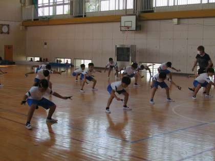体育館は今日も暑くて、扇風機・冷風機がフル稼働です。その中で先生も子どもたちも暑さに負けず、今日も一生懸命踊っていました。3.4年生も全員が真剣です。今日から鳴子を持って踊り始めました。鳴子の音があるとさらに踊りがしまって見えます。