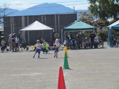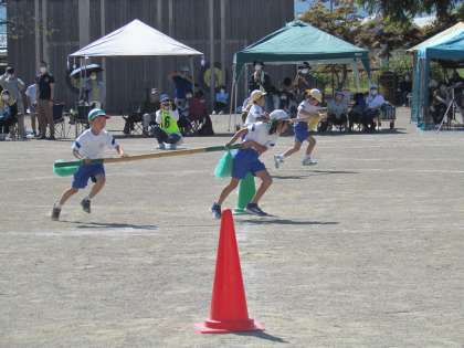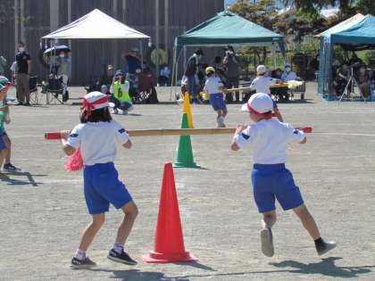 低学年遊競技【ドキドキタイフーン】長い棒を2人でもって台風のように勢いよく走りました。コーンの周りを回るのがとても上手でした。