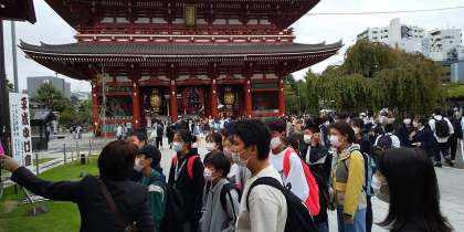 修学旅行〜浅草寺〜 公開日 2022/10/13 更新日 2022/10/13 2025できごと 浅草にやってきました。今までで一番人がいます。修学旅行生というより一般の人、しかも外国人が目立ちます。入国緩和の影響でしょうか。仲見世もみんな開いていて活気があります