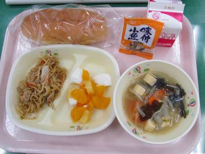 今日は「せわりパン、少なめ焼きそば、わかめスープ、フルーツ杏仁、ミニフィッシュ、牛乳」でした。焼きそばパンにして食べると懐かしい味がしました。