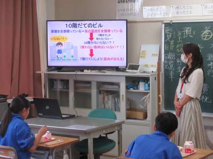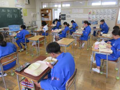10月17日(月)給食センター栄養士さんの給食時指導 公開日 2022/10/17 更新日 2022/10/17 2025できごと 今日の給食の時間に給食センターから栄養士さんが来校し、6年生に給食指導をしてくださいました。「食事と運動で強い体をつくろう」がテーマです。3つの栄養をバランスよく摂取し、適度な運動をすることで、強い体ができることを映像資料を使って話してくれました。オリンピック選手の食事メニュー等も紹介してくれ、身近なよい手本を示してくれました。