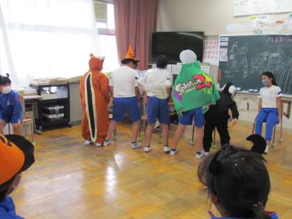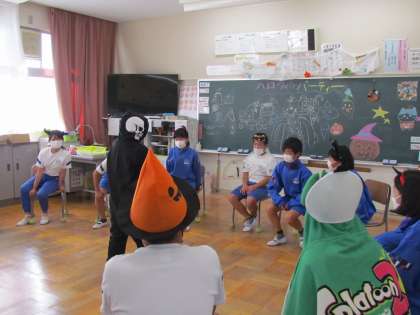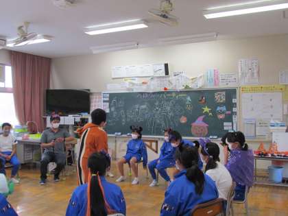 5年生の教室からは楽しそうな笑い声が聞こえてきました。のぞいてみると変装したり、教室にかわいい飾りがついていたり、黒板が賑やかだったり、「ハロウィンパーティー」です。みんながさらに仲良くなれた1時間でしたね。