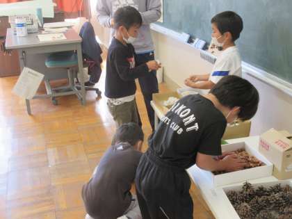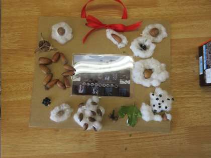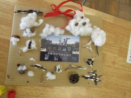 1年生が生活科で育てた植物の実(種)を使って、フォトフレームを作っていました。どんぐりやわた、オジギソウ、アサガオなどの秋を連想させるものをうまく使って素敵な作品ができました。ヤッター!