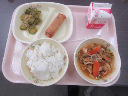「ごはん・牛乳・春巻き・豚キムチ煮・寒天サラダ」のメニューです。具をご飯にのせて、豚キムチ丼にしていただきました。「春巻き」がぱりっとしていておいしかったです。これも調理器具や技法の進歩なのですね。