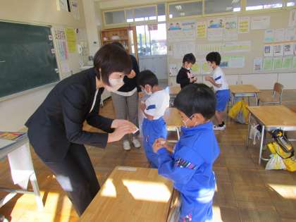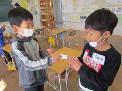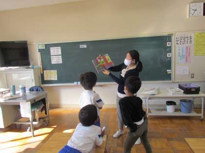リジャイナから送られてきた本を読んでもらい、本物の英語により触れたようでした。その後は英語で「くだもの」の名前を確認し、[I have  a  〜 ]と言いながら自分の持っている果物カードと友達のカードの交換をしました。さて、柿って英語でなんて言うのか知っていますか?