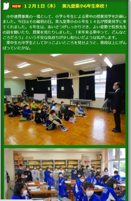 本日、6年生が来年度入学する予定の東中学校に行き、1年生から3年生のいろいろな授業を見学させてもらいました。中学校の学習は難しい?ついていけるか心配だ!などの不安を持っている児童も少なからずいますが、今回の見学で、一生懸命学習している中学生の姿を見て、中学校への不安が少しでも解消していくとよいと思います。東中学校のホームページを見ると、参観している子どもたちの様子もたくさんアップされています。ご覧ください。写真は東中HPの一部を借用しました。
