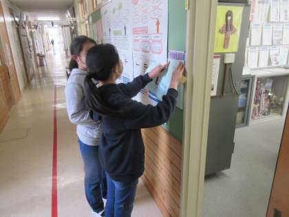 昼休みに児童会本部役員の児童が「今月の生活目標」を貼りに校長室に来てくれました。今月の目標は「寒くなってきたので外では運動をして、中では学力テストに向けて復習や自主勉強をしよう」です。寒さに負けないで頑張ってもらいたいと思います。