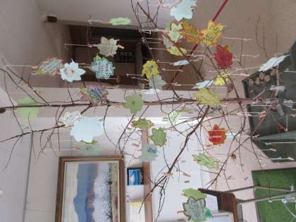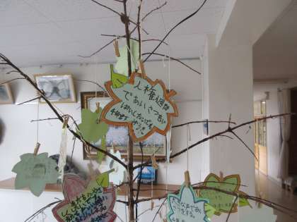 これも人権集中学習の取組の一つですが、人権集中学習期間で各自ががんばりたいことを葉のカードに書き、職員玄関にある「人権の木」の枝につりさげます。現在は写真のようですが、次第に葉も増え、大樹になることでしょう。