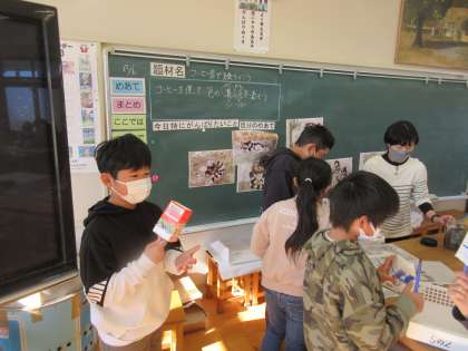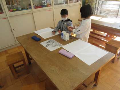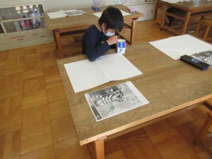 4年生の図工「コーヒーで絵をかこう」の学習です。粉末のコーヒーを水で溶いて、色塗りに使います。濃淡で表す、水墨画の世界のような絵が出来上がるのでしょうか。まだ下絵の段階でしたが、先が楽しみです。