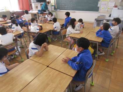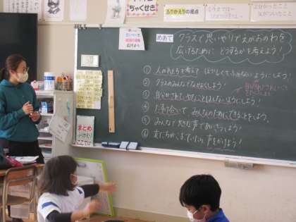 2年生の学活は、人権集中学習期間の活動の一つです。「クラスで思いやりの笑顔の輪を広げるためにどうするか」をみんなで話し合いました。