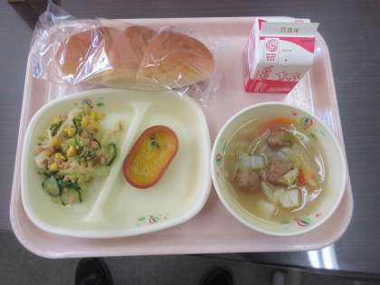 「ロールパン・牛乳・かぼちゃのカップグラタン・白菜と肉団子のスープ・ツナサラダ」のウインターメニューです。かぼちゃや白菜など冬においしくなる野菜がふんだんに使われていました。今日の白菜も藤岡特別支援学校の生徒が育てた白菜だそうです。ありがとうございました。