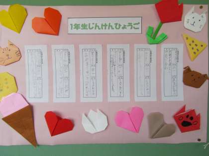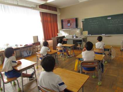 人権旬間中にどの学年も人権に関する映像を見て、考える時間を持ちます。1年生は「きつねとたぬき」のお話です。みんな時折笑いながら、でもとても真剣に見ています。廊下には一人一人が考えた【人権標語】が貼ってありました。