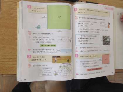 4年生の算数「面積」の学習です。1平方メートルが何平方センチメートルかを学習していました。実物大の面積の紙で面積の大きさを比較していて実感が持てました。