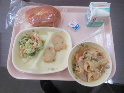 「こめっこパン・牛乳・たこナゲット・下仁田ねぎのおっきりこみ・ごまネーズ和え・角チーズ」の炭水化物攻撃メニューです。(育ち盛りの子どもたちにはこれくらいの炭水化物が必要です。栄養のバランスも計算されています)言わずと知れたぐんまの食文化・おっきりこみには、ららん藤岡から納入された藤岡産の下仁田ねぎが使われています。まさに地産地消の郷土料理です。