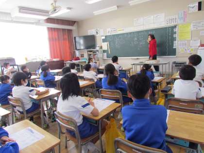 今日の算数はテスト返しとその復習です。2けたの計算や数字を見て工夫して計算することなど、だんだん内容が難しくなってきました。お家でもしっかり復習してきてくださいね。