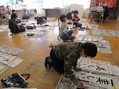 3年生の隣の4年生も【書き初め】練習です。4年生は【美しい空】という字に挑戦しています。こちらは床の上でスペースをとって、静かに書き進めていました。