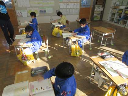 2学期も最後の週となりました。冬休みまであとわずか、各学年ともまとめの学習や冬休みに向けての学習が行われています。1年生の国語では「てがみでしらせよう」の学習を行っていました。知らせたいことを絵や文でかく練習です。