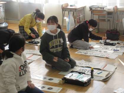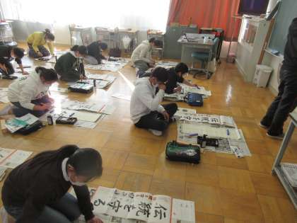 もうすぐ冬休みなので、6年生は書き初めの練習を行っていました。久しぶりの書き初めなので、うまく書けるか心配してましたが、床で書くと、新鮮な気分になりますね。
