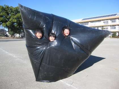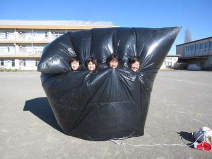 最後にバルーンの中に入って、中の空気があたたかいことを体感しました。この実験を通して、あたためられた空気は上の方へ動くことがわかりました。