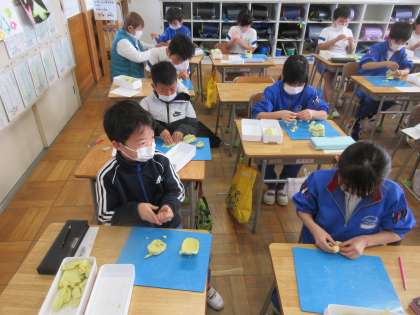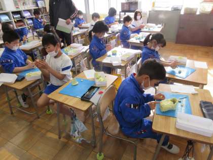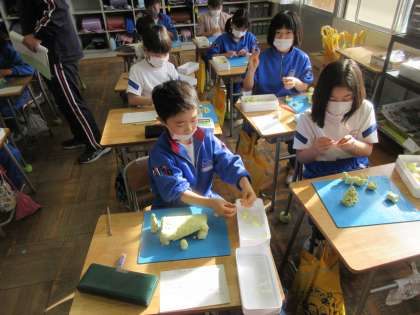 2年生の図工「思い出を形に」の授業風景です。粘土を使って、思い出に残っているものを造形していました。一人一人の個性が形になって表れています。