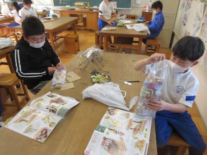 4年生も図工「ひみつのすみか」の学習です。木を組み合わせて「ひみつのすみか」を作ります。枯れ枝等を集めてきている児童もいました。どんなすみかがこれからできるのか楽しみですね。