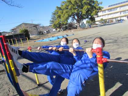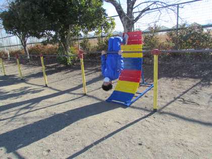 鉄棒のところにカラフルな逆上がり器が登場しました。本校の業務員さんが古くなった逆上がり器をまるで新しく買ったもののように直してくれ、ピカピカになりました。早速、逆上がりを試してもらいました。これなら、みんな逆上がりができるようになるでしょう。