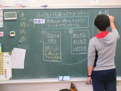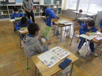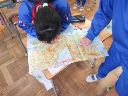 4年生も元気です。4年生は社会「伝統や文化を受け継ぐ」で、群馬の地場産業である「桐生織り」の学習していました。地図帳を使って、「東の桐生・西の西陣」の場所を調べていました。