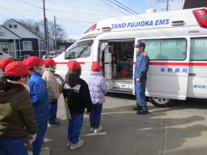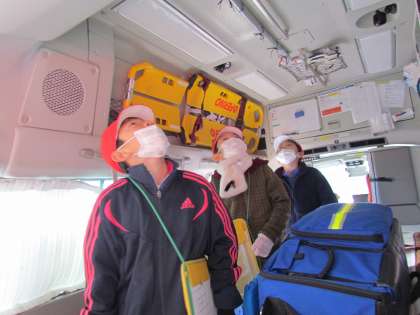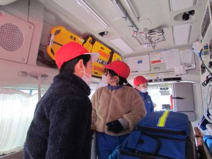 楽しみにしていた消防署見学に行って来ました。まずは消防署にあるたくさんの消防車の見学です。救急車は実際に入って中を見学させてもらいました。いろいろなものが積まれていました。