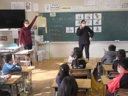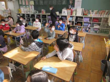 2年生の外国語活動です。今日のめあては「楽しく体を動かそう!」。じゃんけんゲームや、プリーズゲーム、ジェスチャーゲームを行いました。とても楽しそうです。