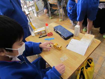 くぎを木板に打ち込んで、それぞれが思い思いの作品を作っています。釘の向きを変えたり、打ち込む長さを工夫することでいろいろなものを表現していました。さらに自分の作品に色をつけて、さらにアイデアを広げていました。
