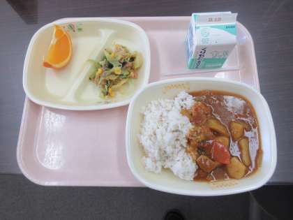 「麦ごはん・牛乳・ポークカレー・小松菜サラダ・オレンジ」の金曜カレーメニューです。何事もスタンダードは落ち着くものです。いろいろなバリエーションのカレーもよいですが、やっぱりスタンダードなポークカレーが落ち着きますね。唯一の気がかりは、このあと授業参観ですが、服が黄色模様にならなければよいのですが・・