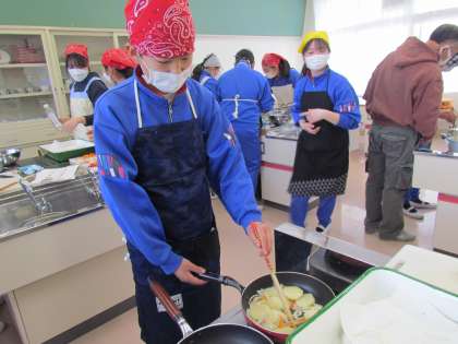今日のメニューは【ベーコンの野菜巻き】と【ジャーマンポテト】です。まずは野菜の皮をむくところから苦戦していました。にんじんを切り、インゲンのすじを取ってゆで、ベーコンで巻いていきます。また、じゃがいもを薄くスライスし、ゆでたらタマネギなどと炒めます。だんだんいい香りがしてきました。