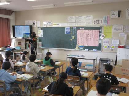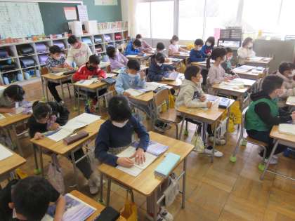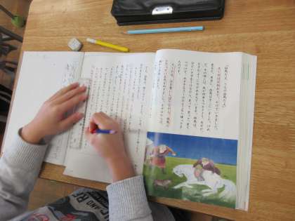2年生も国語です。「ス—ホーの白い馬」の学習も終盤に来ました。今日は馬頭琴を作るス—ホーの様子を考えました。様子がわかる部分に線を引いていました。