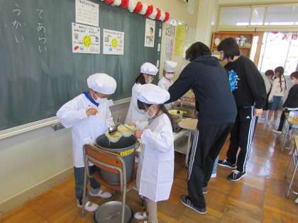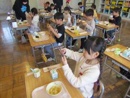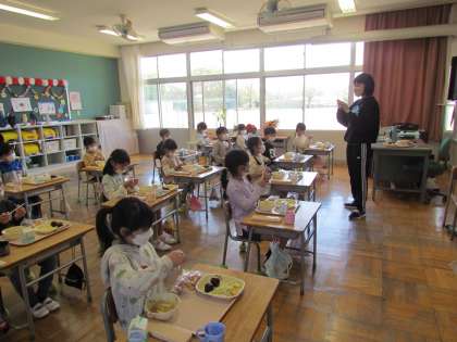 今日は1年生にとって初めての小学校での給食です。給食着を当番の子が着て、上手に給食をよそっていました。担任の先生から給食のきまりを教えてもらい、その通りにして、みんなで【いただきます】ができました。
