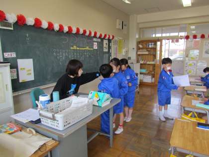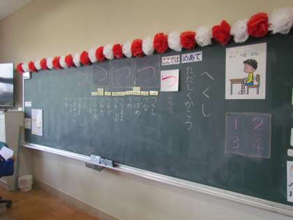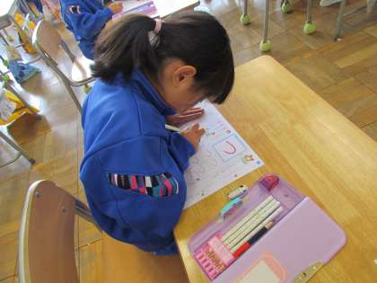 1年生の今日の国語はひらがなの練習です。一息で書ける「つ」の練習をしていました。みんな真剣に書き、できると担任の先生のところに行って◎をつけてもらいます。