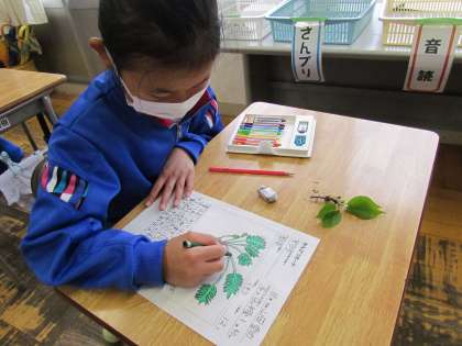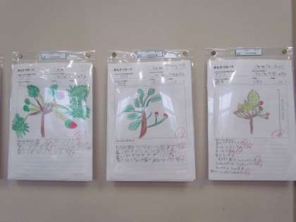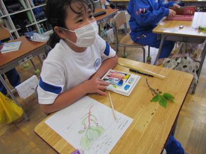 4年生は桜の枝を観察カードに書いていました。よーく見ると小さなサクランボがついています。ずいぶん葉っぱも大きくなっています。今年の桜の成長はとても早いですね。