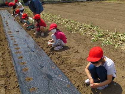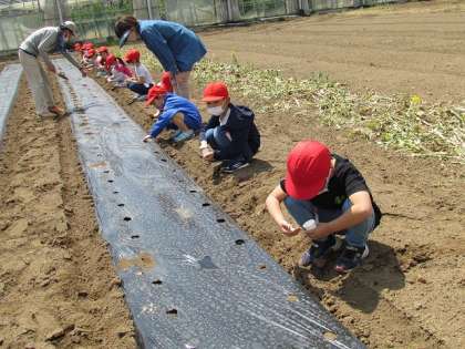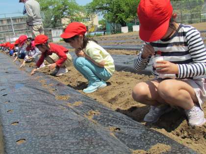 今日は【とうもろこし】と【枝豆】の種まきです。畑の準備は全てしていただいてあり、あとは種をまくだけです。最初に1年生が畑に行き、まきました。種を小さな穴にまくのもなかなか難しい。でも、全員が上手にまくことができました。