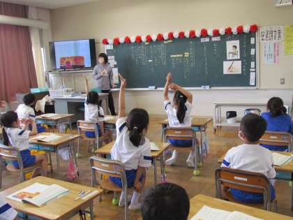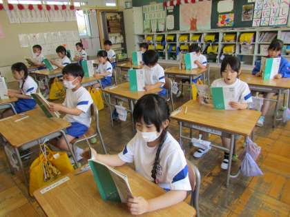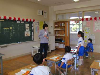 今日から5月です。さわやかな月曜日になりました。世間はゴールデンウィークで、観光地はコロナ前と同じように混雑しているとのことですが、今日明日、学校は通常営業です。さて、1年生は元気よく国語の教科書の【あさのおひさま】の音読です。内容についてもよく考えて、発表していました。