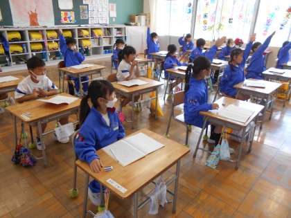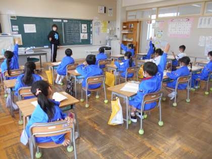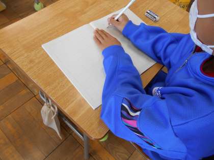 1年生のひらがな学習はどんどん進んでいます。はじめに、これまで習ったひらがなを使った単語を自分たちで考え、ノートに書きました。いろいろな単語が発表されました。その後のひらがな学習は「ひ」です。