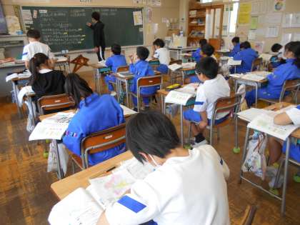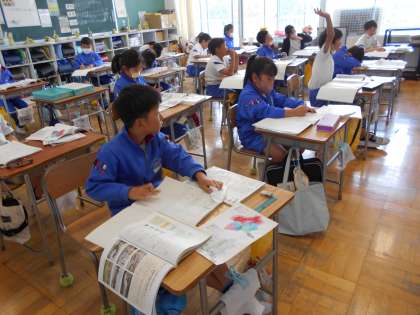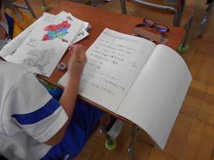 白地図に書き込んだり、色を塗ったりしながら群馬県の交通の様子について考えました。積極的に発言する子が多く、交通の便が良い高崎市は人口が多いなど、いろいろなことに気づきました。