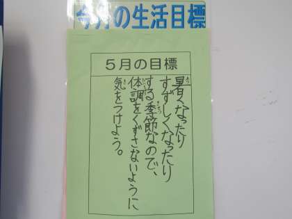 児童会役員さんが職員室にある【生活目標】を5月に変えてくれました。【暑くなったり、涼しくなったりする季節なので、体調をくずさないように気をつけよう。】まさにその通りですね。GWも終わってしまいました。さあ、ここからまた、がんばりましょう。