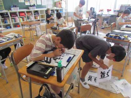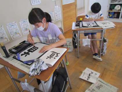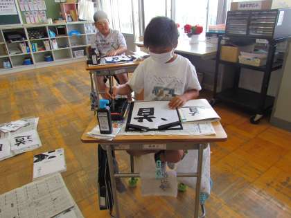 今日の字は【道】。一文字なので半紙に大きく、書いています。【しんにょう】の部分が難しいけれど、一画一画丁寧に筆を動かしていました。